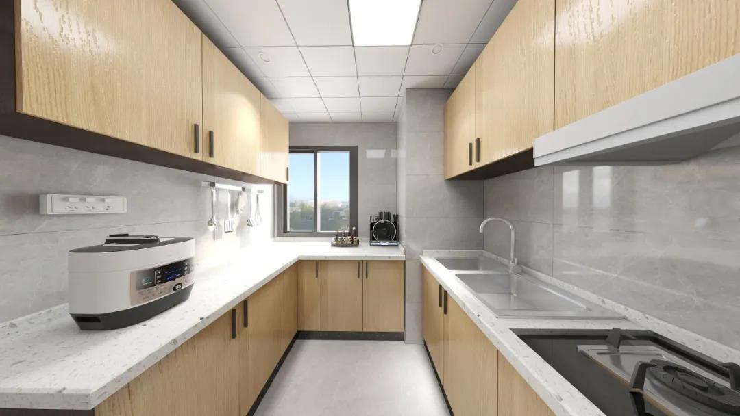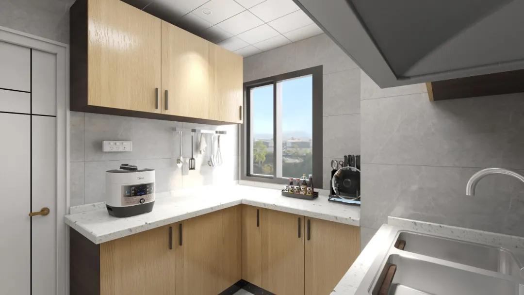走进厨房,映入眼帘的是"木纹色+浅灰砖"搭配。跟以往的不一样,少了老旧厨房的气息。整体以实用为主,有效利用空间格局,提供厨房的有效利用率。